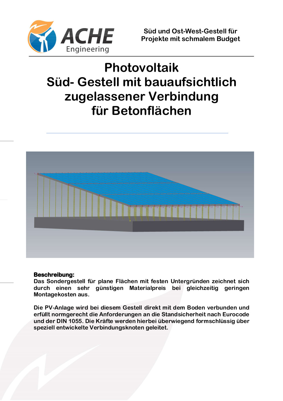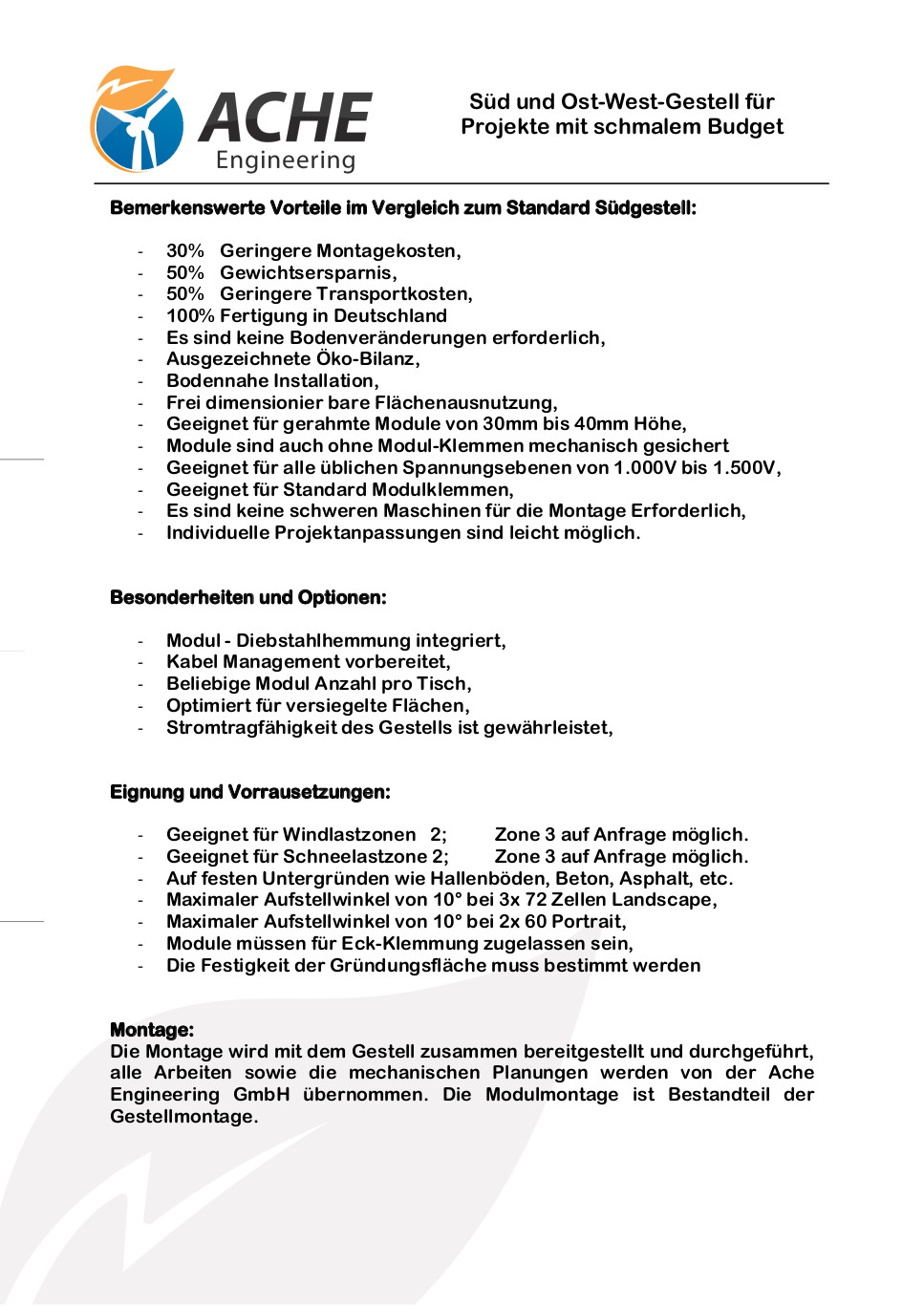 Die bei der Ache Engineering GmbH, einem international täigen Ingenieuerbüro für erneuerbare Energien aus Mittelhessen geplante und entwickelte Unterkonstruktion erfüllt sämtliche Stabilitätsanforderungen und lässt sich schnell, einfach und extrem preisgünstig auf flachen und festen Untergründen montieren.